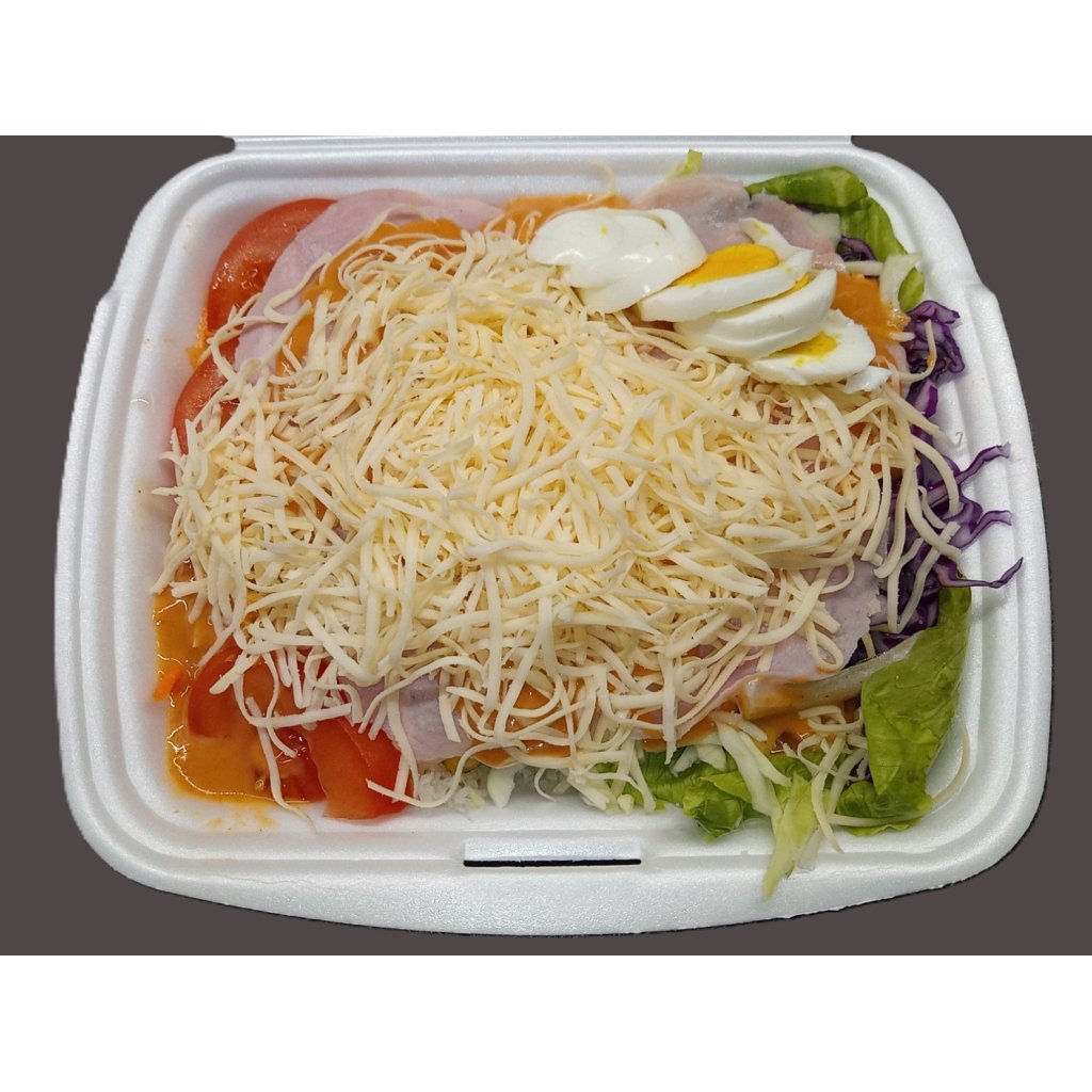 Ledovka, mrkev, rajčata, okurky, bílé zelí, červené zelí, kukuřice, cibule, šunka, sýr, vajíčko, dresink