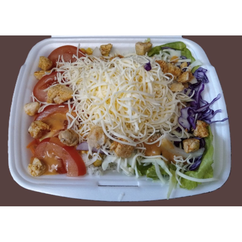 Ledovka, mrkev, rajčata, okurky, bílé zelí, červené zelí, kukuřice, cibule, kuřecí maso, dresink, sýr
